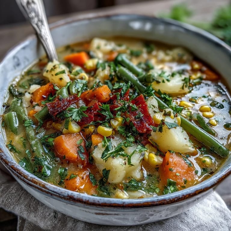 - Stir in the potatoes, corn, and green beans, mixing everything together so the vegetables are evenly distributed. This is where the soup starts to come together.