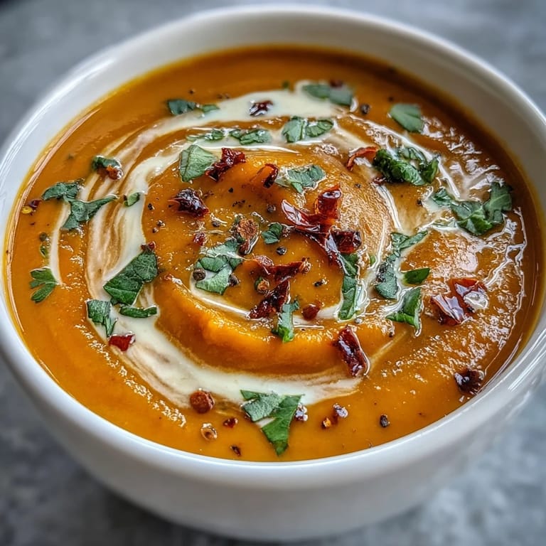 My partner brought home the most beautiful bunch of fresh coriander one evening, and I knew exactly what soup needed it as a finish. The way it brightened the golden-orange bowl, that peppery snap against the creamy warmth—it transformed from practical dinner into something that felt a bit celebratory. We had seconds without even discussing it, just quiet contentment.