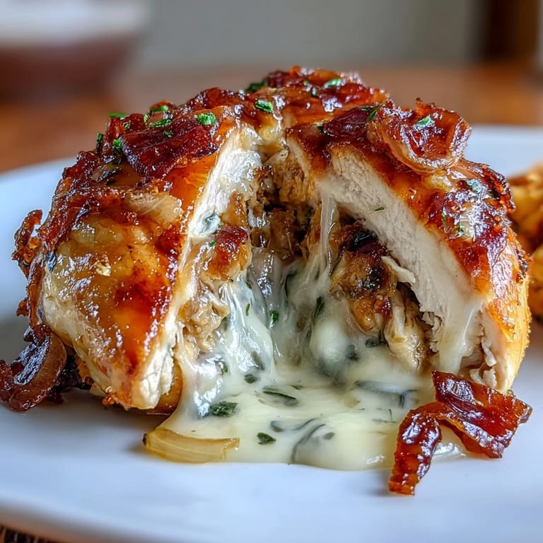 Save One autumn evening, my neighbor brought over a bowl of French onion soup, and I found myself staring at those glossy, caramelized onions swimming in rich broth, thinking there had to be a way to capture that magic in something different. The next week, I was standing in my kitchen with chicken breasts and an idea: what if those deep, sweet onions could become a stuffing? The result was this dish, and it's been a weeknight revelation ever since.