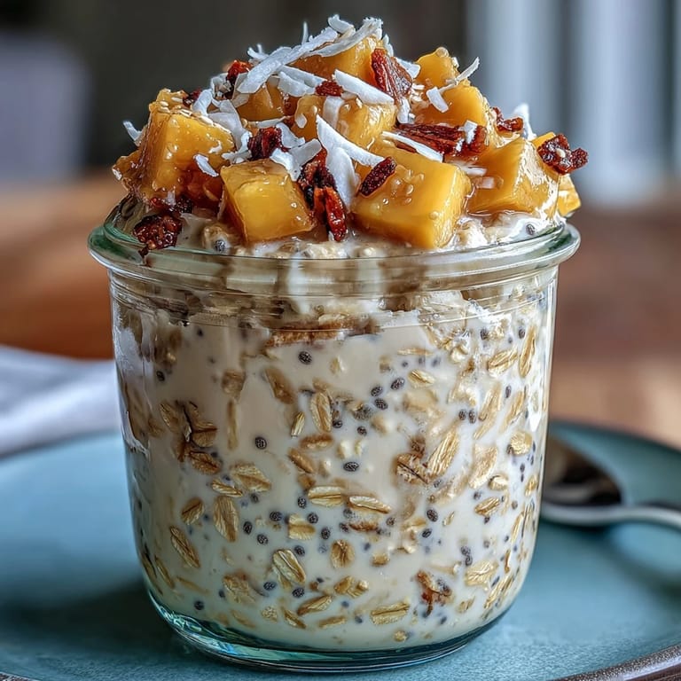 Save Last summer, I was stuck in that frustrating rhythm of skipping breakfast because mornings felt chaotic. A friend mentioned she'd been making overnight oats the night before, and I remember thinking it sounded too simple to actually work. But then I tasted hers—creamy, tropical, nothing like the sad desk breakfasts I'd been grabbing. That first spoonful with the soft mango pieces and coconut made me realize breakfast didn't have to be rushed or boring.